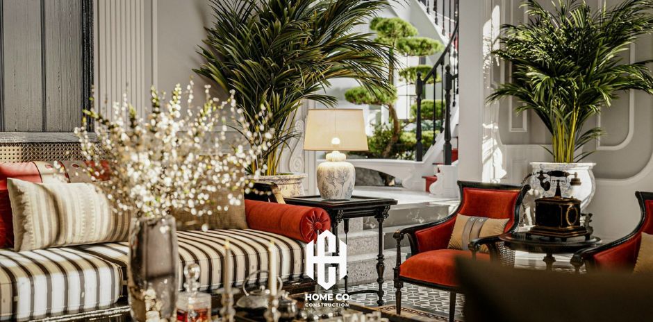 Nội thất phòng khách được thiết kế theo phong cách tân cổ điển kết hợp Indochine