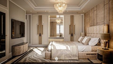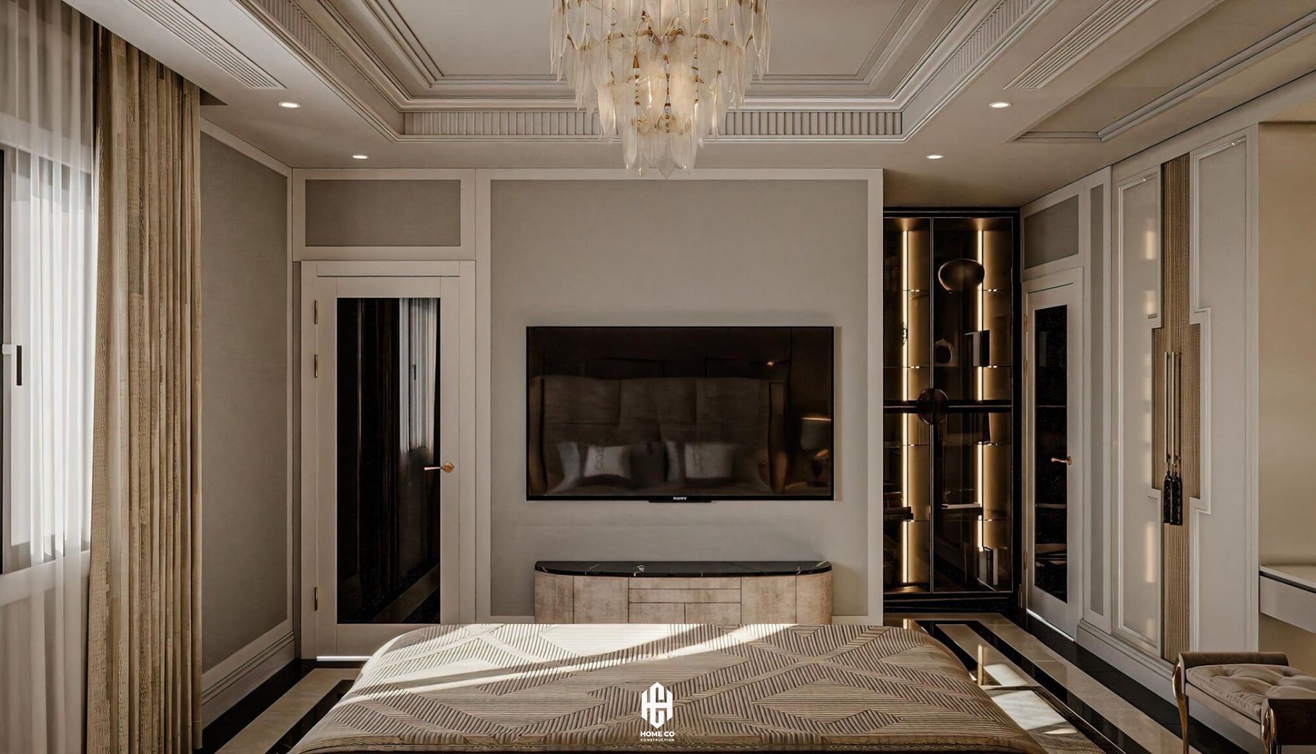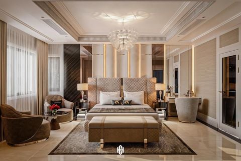 Phòng ngủ master với thiết kế hiện đại, sử dụng tông màu trắng – be mang lại sự thanh lịch và thư giãn